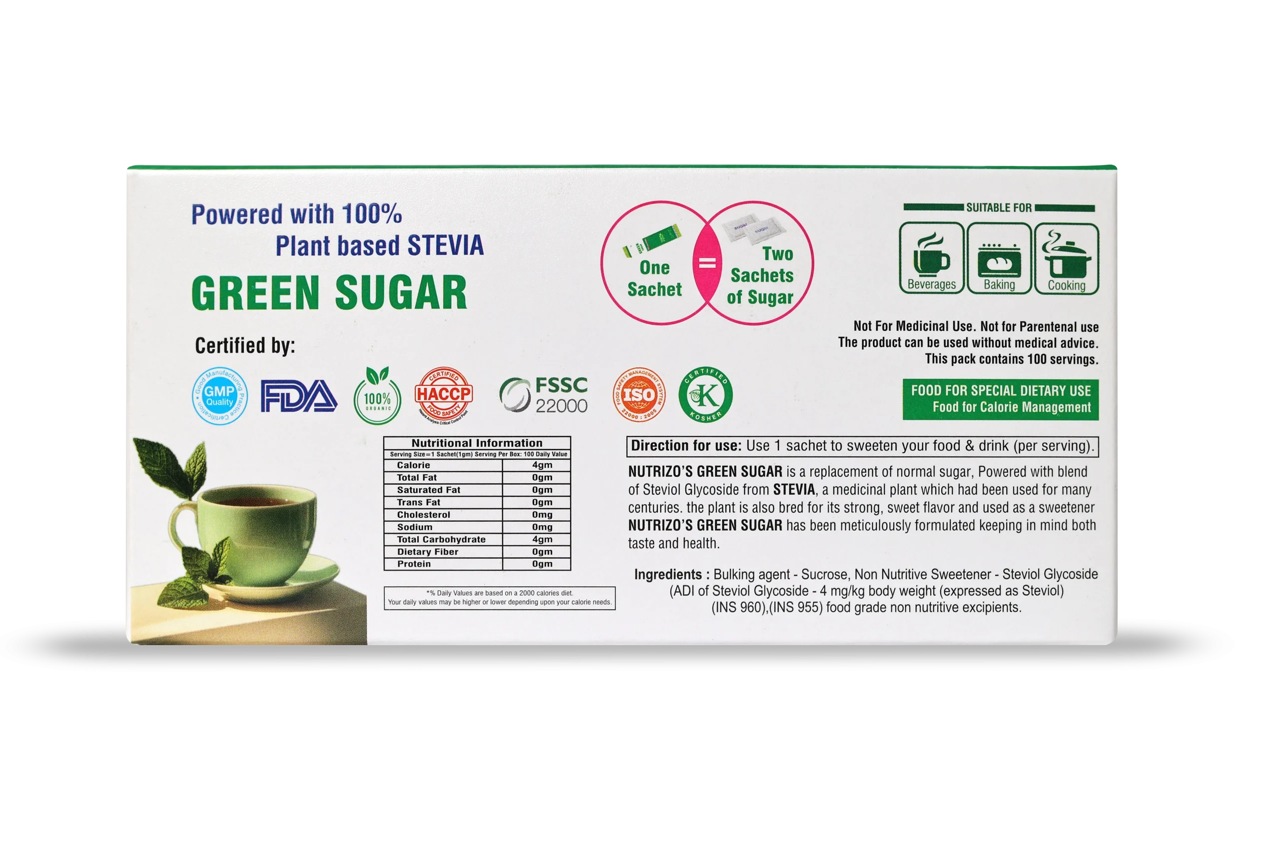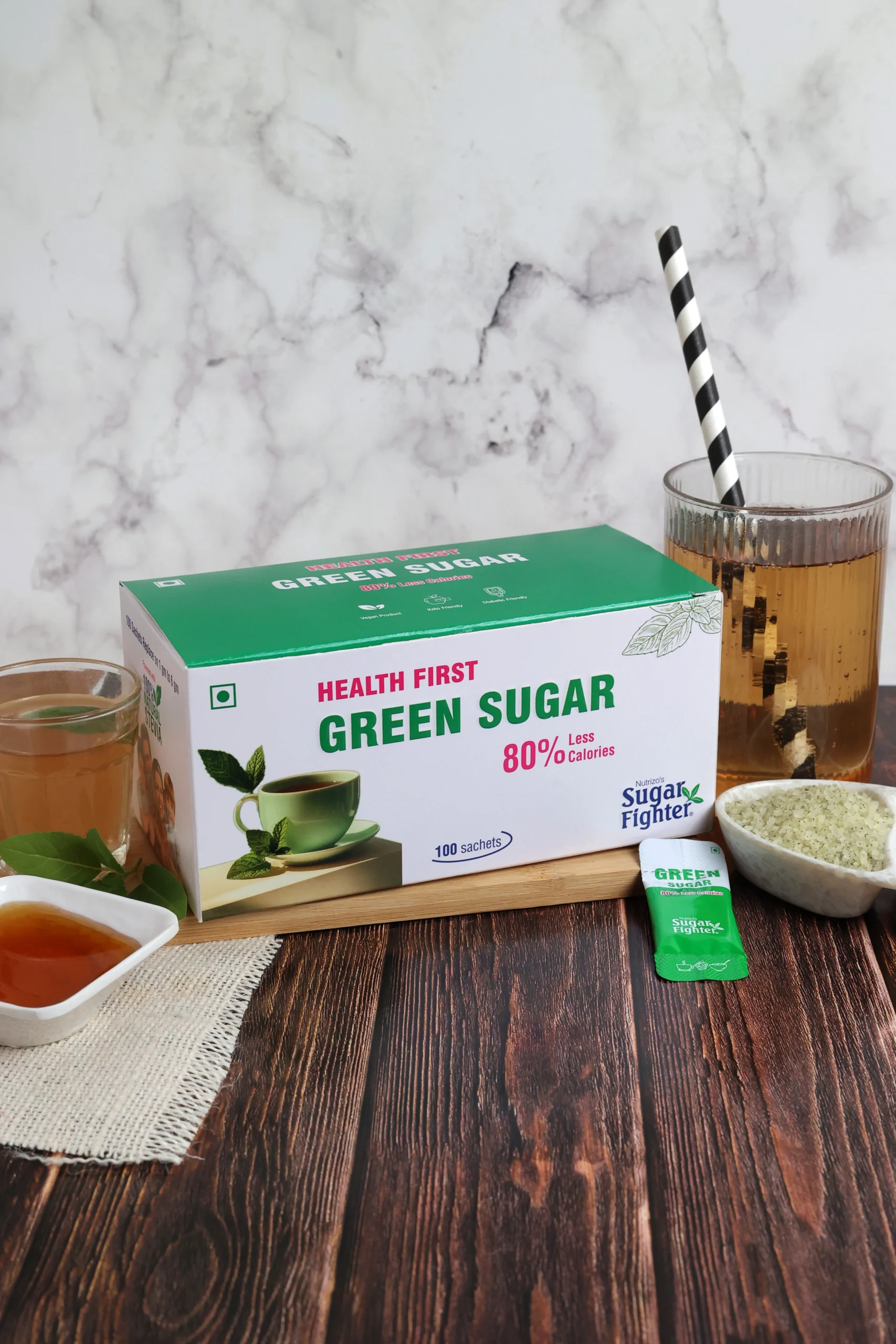Green Sugar is a 100% natural, zero-calorie sweetener made from Stevia, offering a healthy alternative to regular sugar without compromising on taste. Each sachet is pre-measured for convenience and dissolves quickly in both hot and cold beverages, as well as various recipes, making it perfect for use at home, work, or while traveling. Ideal for diabetics, keto followers, and health-conscious individuals, Green Sugar contains no artificial additives, has a zero glycemic index, and each sachet equals 2–3 teaspoons of sugar. Enjoy guilt-free sweetness with Green Sugar – your natural sugar-free solution.